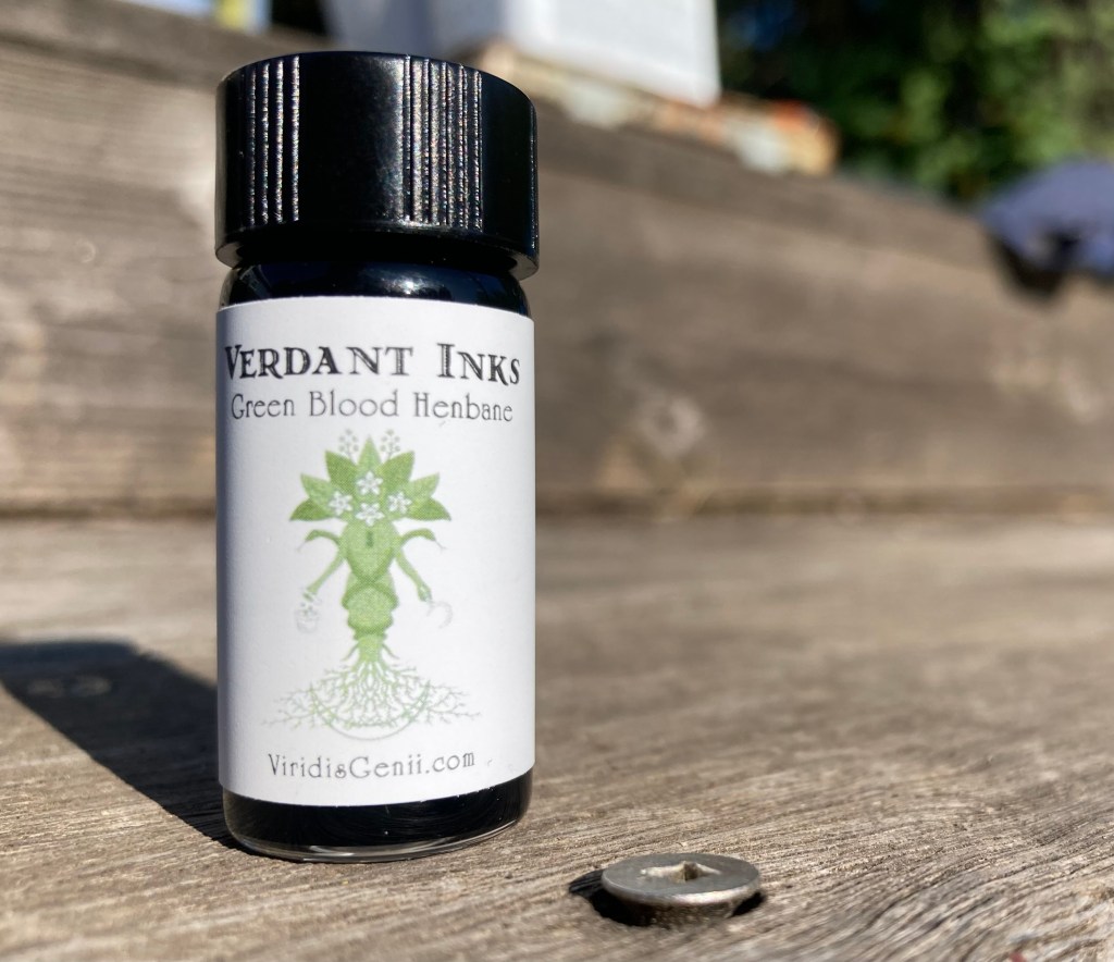 After some searching and consideration (how do I familiarize myself with this plant in a visceral and visionary sense, without putting myself into a coma?) I settled on this Verdant Inks Green Blood Henbane from Rosarium Blends5 out of Washington: