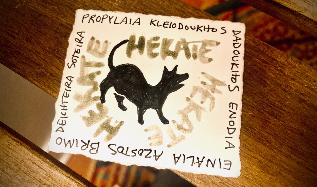 Before bed I arranged a dream talisman on the cabinet near my head, laid down and then reached back up, put my hand on it. I asked Hekate to visit me in dream once again, with a clear symbol or message I would understand. I have the sense that I dreamed something long and involved during the night but don’t remember any of it except right before i woke up at 7am: a puppy standing in a field with a larger dog, both looking out over a cliff. Sunrise or sunset I think. Then suddenly I was the puppy, calling in a child’s frightened voice, “Mama?”