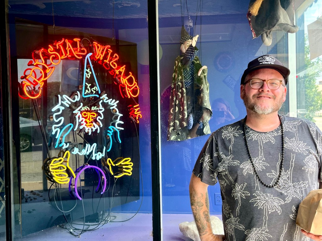 After a heavy, satisfying lunch of heartland barbecue, Bill and I visited The Crystal Wizard, an old-style esoteric emporium in South City. Back when I lived in the neighborhood, the shop was run by two grizzled hippies and featured biker porn, a talking parrot, and a display case of WWII (ie Nazi) collectibles. The hippies, the smut, the bird and the swastikas are all gone now, but much of the grimy character remains intact. We had to call a handwritten phone number on the front door to be let in, and after perusing the daggers, candles, blacklight posters, and sports memorabilia, I settled on a few boxes of incense. When I told the current proprietor to “keep the change” she offered us some granola bars as thanks.
