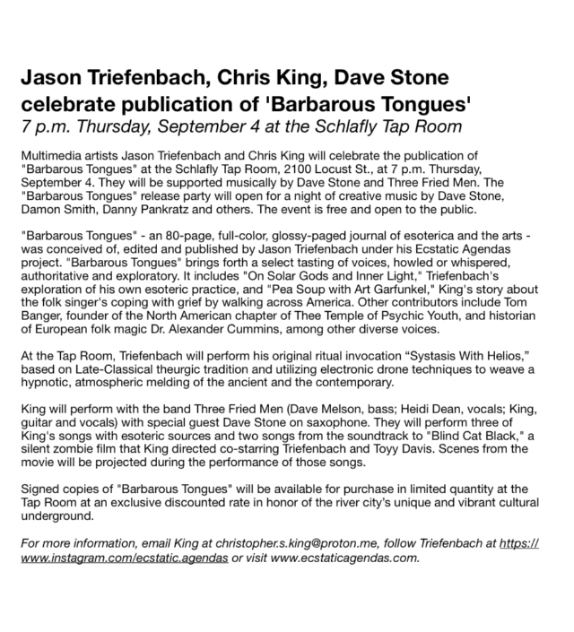 After 34 years of fold-and-staple zine making, Barbarous Tongues represents my first foray into professionally bound desktop publishing. I hope you will join me in celebrating the achievement of this lifelong goal by picking up a copy for yourself! In addition to the 80pp perfectbound paperback edition available HERE, I have also listed a pdf version for those living outside the US who would like to avoid our astronomical international shipping rates. That can be had HERE.