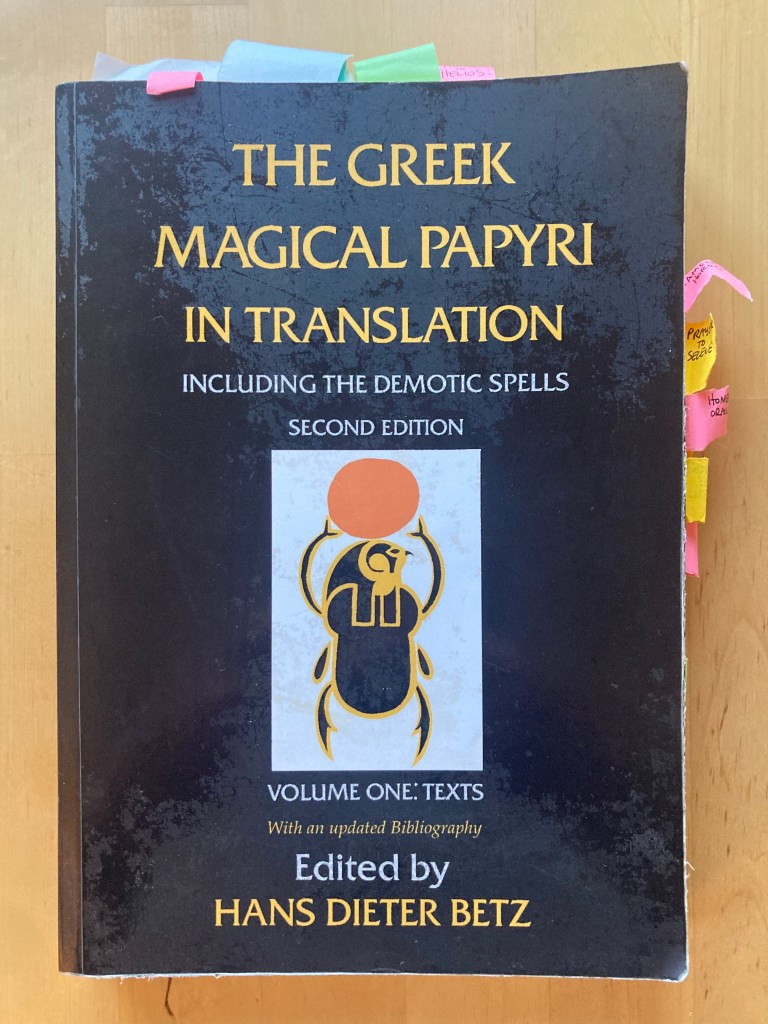 But the papyri, as collected in a volume by Hans Dieter Betz, are my main source of magical praxis these days. Betz’ translation is sort of a recipe book really – there isn’t any discussion of philosophy or the WHY and HOW of magic. It’s just a huge compilation of mostly short little spells by so-called working magicians – sorcerers for hire – in the ancient Mediterranean. There’s currently a fair amount of buzz around this flavor of magic- a lot of books are being published about it and random people on facebook will happily tell you how to do it